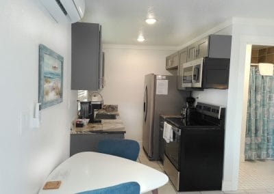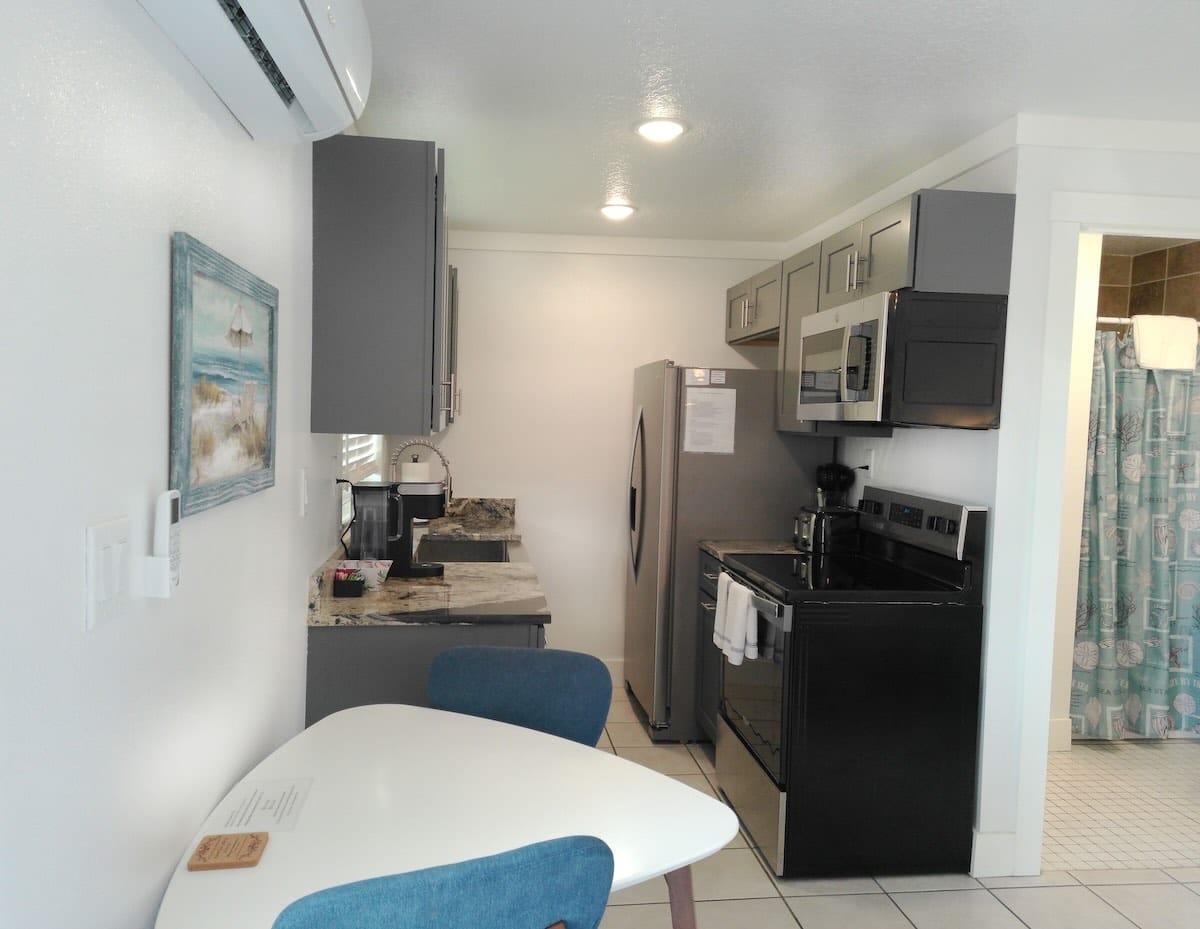 Enjoy the freedom to cook and dine on your own schedule with the suite’s full kitchen, featuring a refrigerator, stove, oven, microwave, and all the essentials you need. Whether it’s a romantic dinner for two or a quiet morning with fresh coffee and coastal air, the Bermuda Suite offers the comfort of home with a peaceful seaside backdrop.